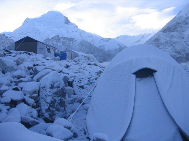 20th Sep – Snow, snow, snow. Good if you’re waiting for a White Christmas. Bad if you’re trying to climb a big mountain. It has snowed all last night and all day today at ABC, without even our intermittent sunny spells that we have become used to. Tomorrow we go back up to Camp 1 so we’ll find out if it’s been snowing as much up there. Communications were bad with other groups on the mountain tonight, so it’s not clear how latest conditions are.