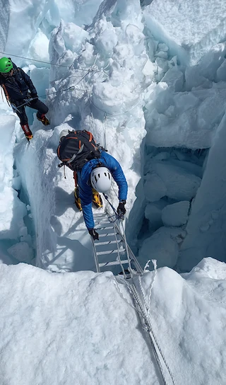 Days 11 - 14 | Ascent of Lobuche East (6119m). By acclimatising on Lobuche we can reduce the number of times we have to travel through the Khumbu Icefall down to 3 journeys. Teams that don’t acclimatise elsewhere will normally have to make an extra journey through the icefall in readiness for a summit bid. |