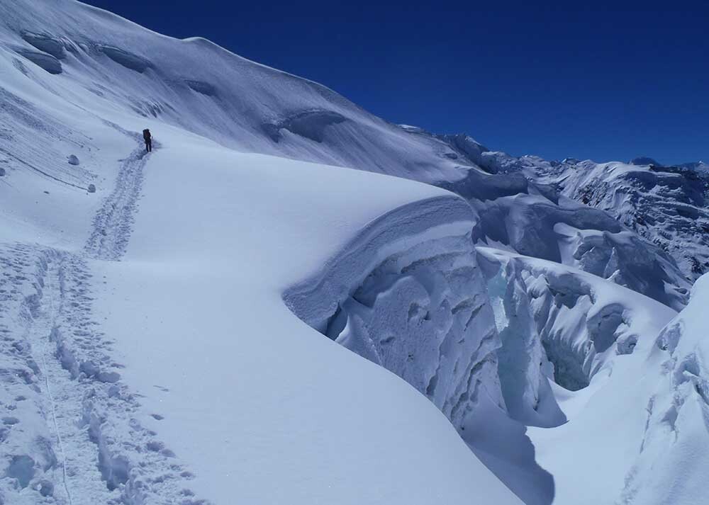 24th October: The fin of Himlung Himal is climbed after crossing a 6500m glaciated dome and descending to the Col of Camp 3. Most of the team are now bedding down at Camp 1 at 5670m in a real suntrap of a Cwm on the other side of the dome. Camp 2 is nestled directly above us. Today’s route wriggled its way up the glacier through crevasses and stable Seracs. Pete, Jim and Ken are using the day for extra acclimatisation and just touched Camp 1 today moving up to Camp 2 Tomorrow. Zac