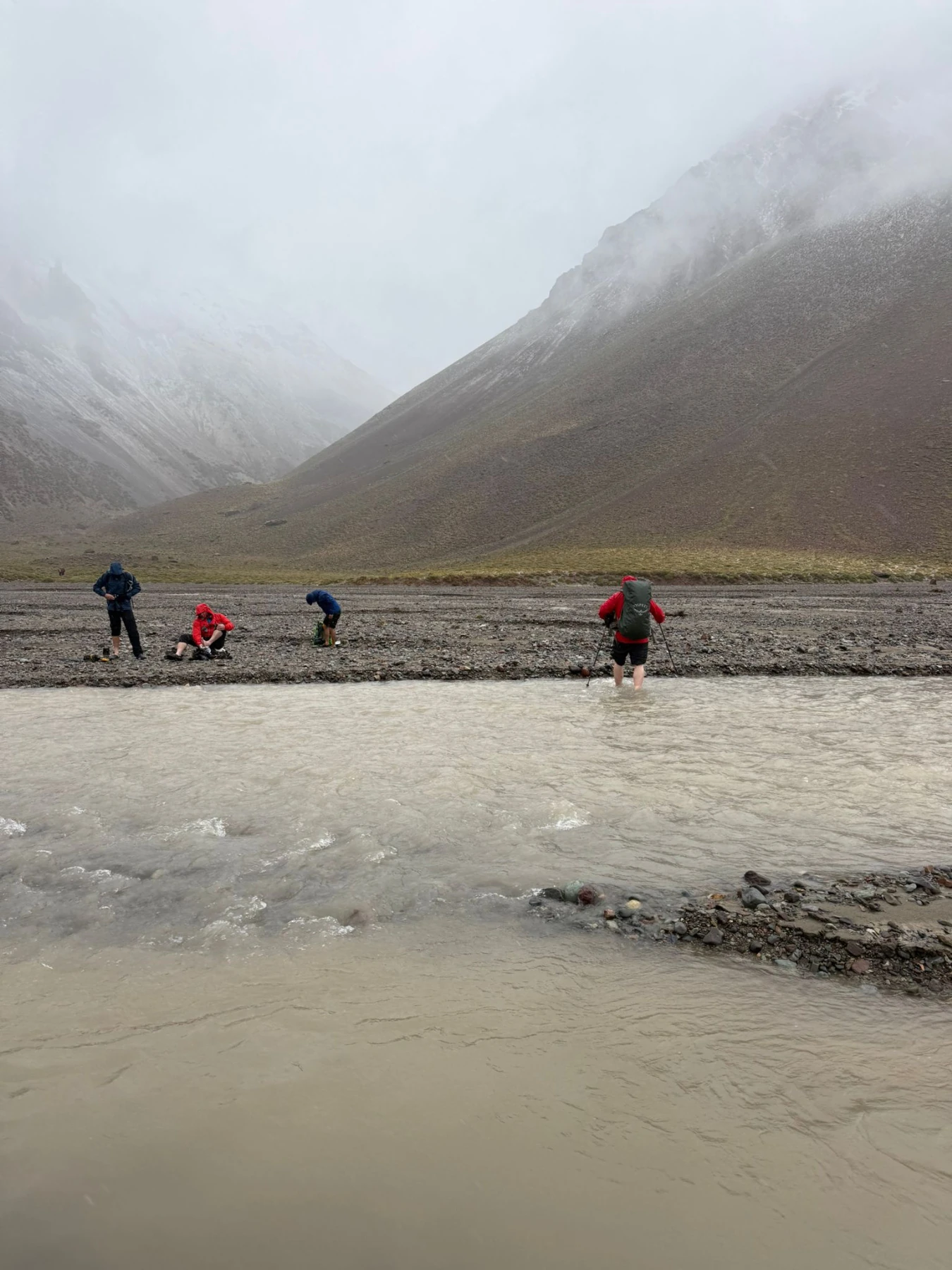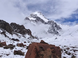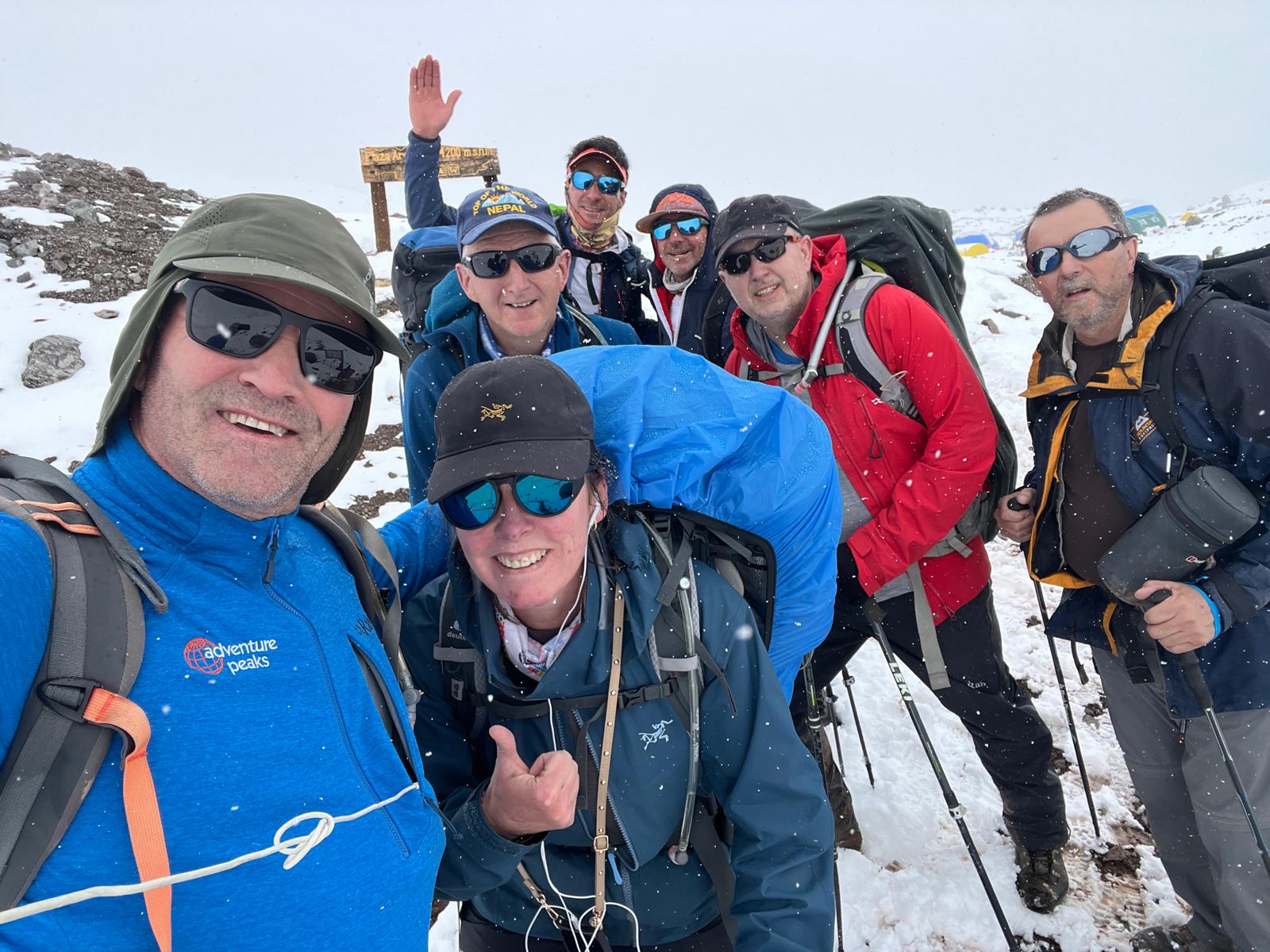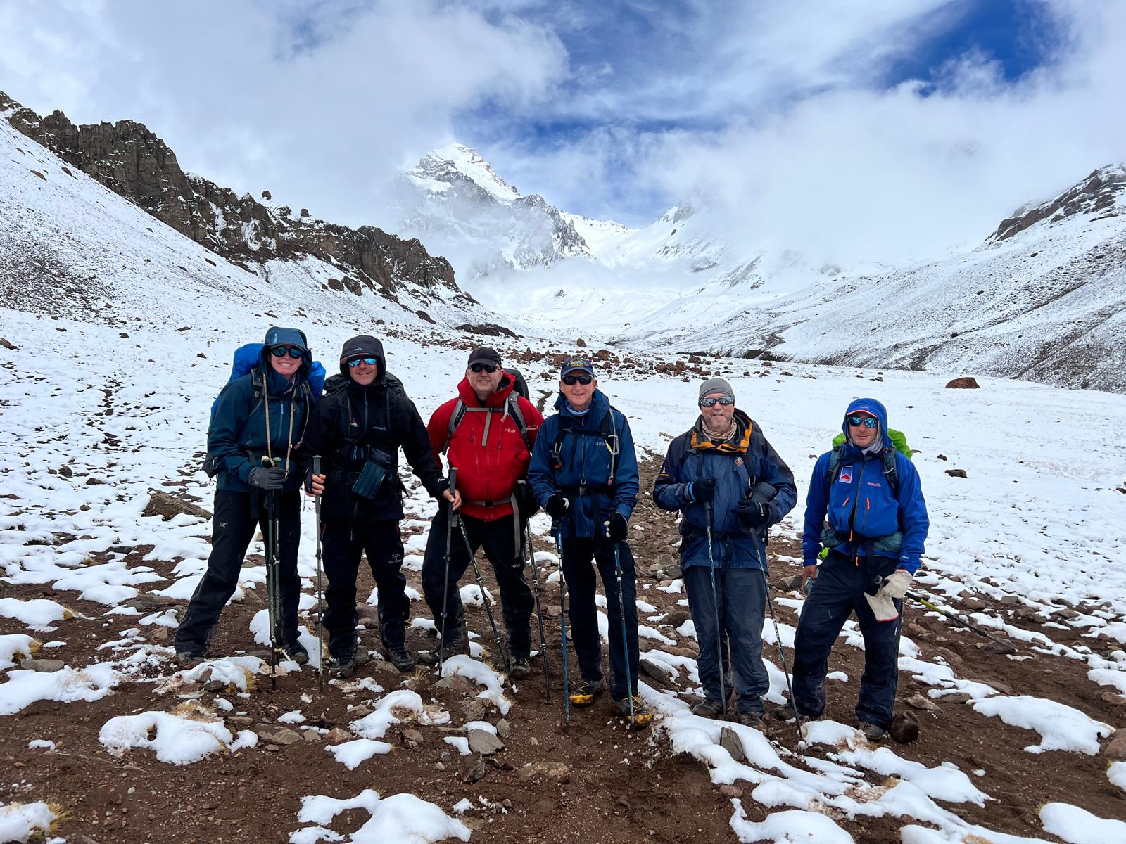 Steve has reported that the team have now arrived at Plaza Argentinas, the base camp on the Vacas valley side of Aconcagua. Tough day today to base camp at 4,200m, all arrived safely, 8hrs walking, all glad to see camp, started off cold and wet with rain and a very cold river crossing in Crocs, was like needles in our feet it was that cold, rain gave way to snow, then the cloud thinned giving some great views and a bit of welcomed warmth, we are looking forward to a rest day tomorrow before going to camp 1.