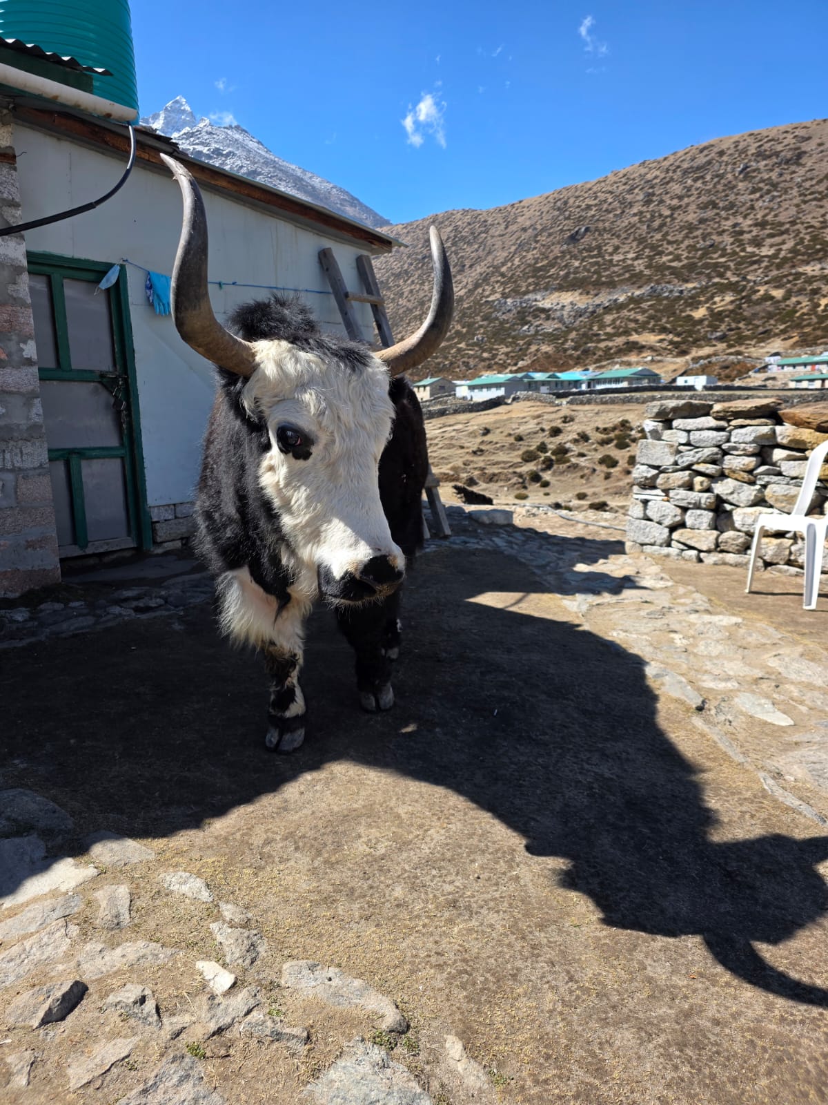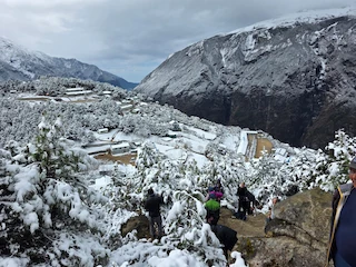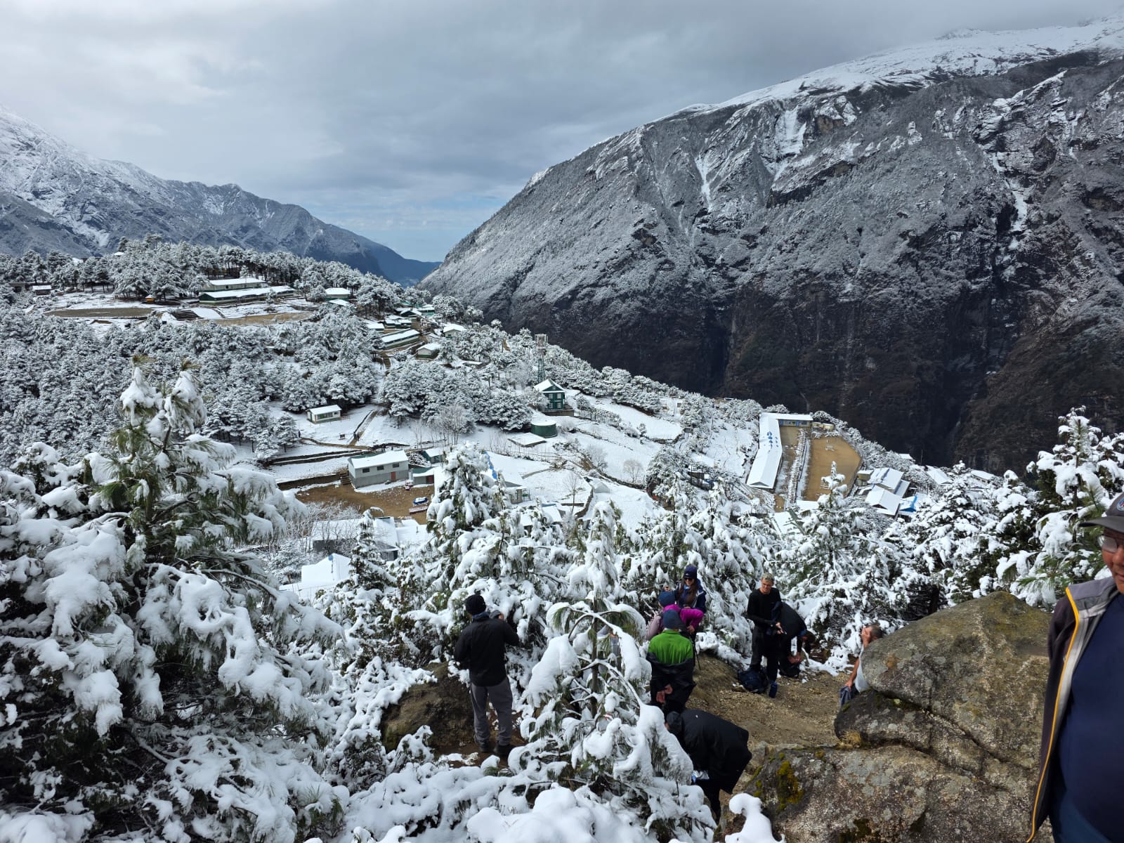 The team has now arrived in a snowy Namche Bazaar after their delayed start, looking forward to the rest of their trip.