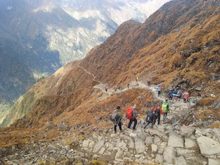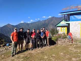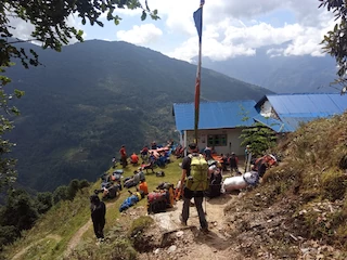 We have arrived at Pangcongma in good form. We had good conditions for both day's walking, with the cloud building slowly, but no rain until evening. The drive to Ramechhap was a testing 7hrs, with the roads in very poor condition, but the folks enjoyed the flight. We were very, very tired, the later arrivals having had no sleep before our midnight departure, but once we got walking, all was good.
