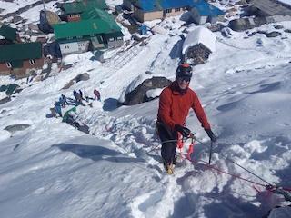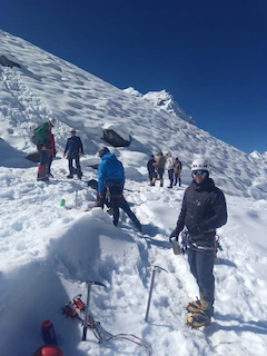 We are on our acclimatisation day at Khare, and all the team have thoroughly enjoyed it. We benefited from the recent snows, in that we didn't have to walk more than 30m from the tea house to practice our rope and crampon skills. Then, after a good lunch, (when everyone still had a great appetite, notable over 4900m), we had an extremely scenic walk up to 5200m. The moraine ridge had simply fantastic views of the whole valley, Mera Peak itself, our onward route, and countless other peaks.