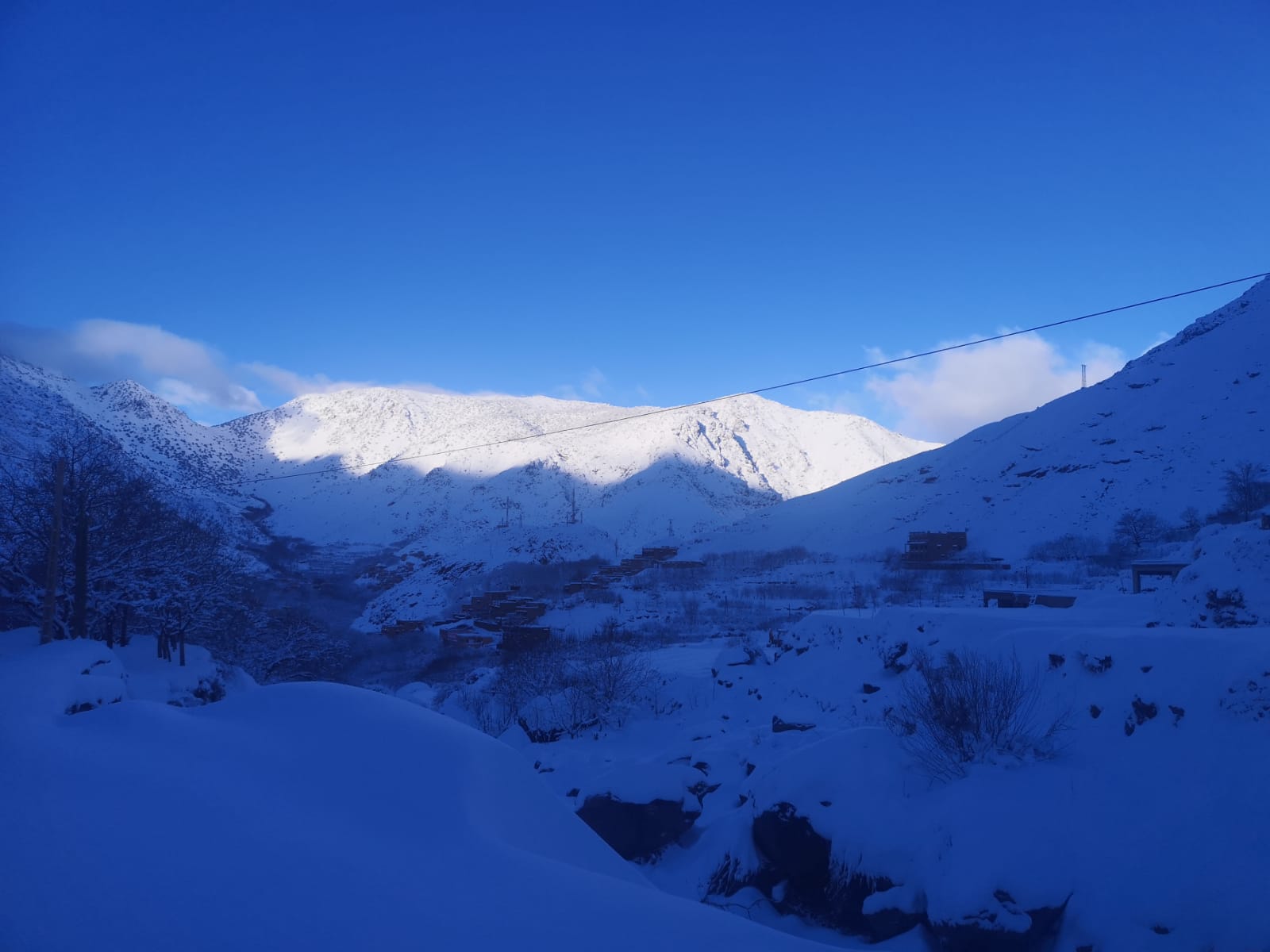 Today we walked up to the pass of Tizi n Tamatert from Imlil. It was very peaceful trekking up through the snow covered pine forest. There has been at least a foot of snow deposited, however today was very much a contrast to yesterday with blue skies and no wind. From the pass we were rewarded with views Tizi n'ou Addi, where we should have trekked over yesterday, had conditions been in our favour. We could also see the village of Tacheddirt.