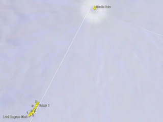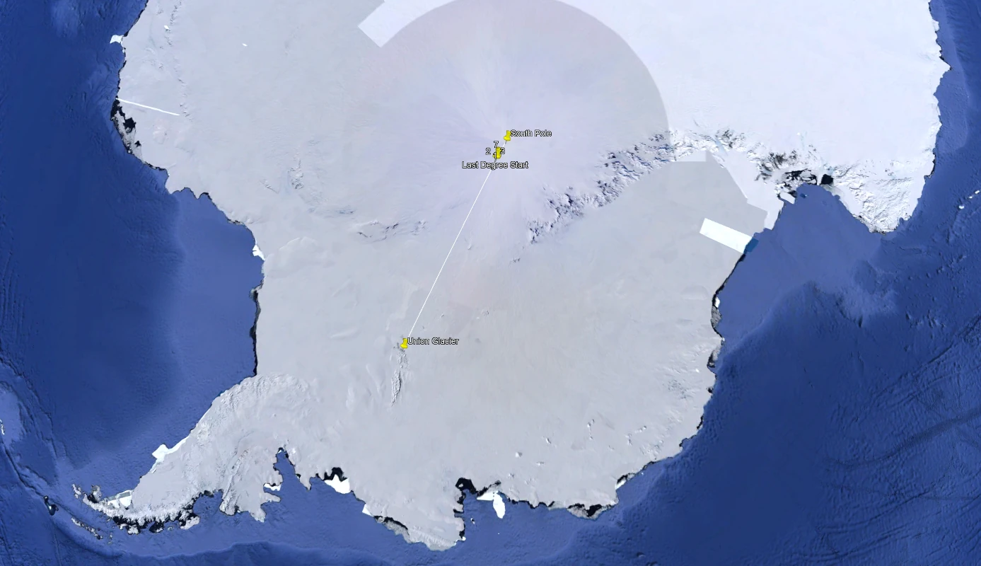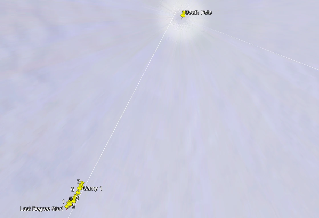 Shaun flew to the last degree start point on the 7th Jan and the team began their first day of the journey to the South Pole yesterday. Unfortunately, the map above can't really show the line they are taking towards the pole, so we have transposed the track points onto Google Earth.