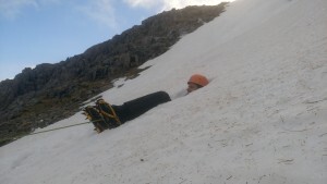 Sunday: Wet, wet , snow, wet, wet was the order of the day! The team headed up to Stob Bhan on the Mamores, where we found some old snow to practise some skills. After that we ascended the peak and descended down the North Ridge scramble. We were all soaked to the skin – a 9 out of 10 wet day – you only get a 10 if you’re swimming.