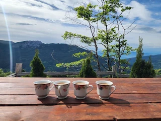 Day 7 | Peak Plat & Wild Camping in Leshnica. We set off directly from the hotel, following a gentle dirt road beneath Ceripashina Peak. Our goal is Peak Plat, offering one of the best 360° panoramas on the entire range. After descending into Upper Leshnica, we reach our magical wild camp: deep pine forest, three converging rivers, and a star-drenched night sky. |