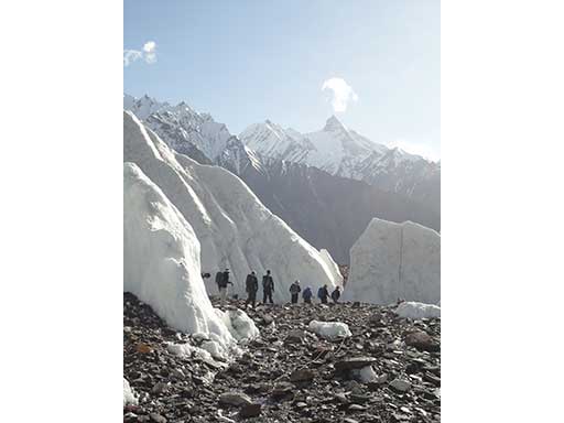 Day 8 | After one hour we climb up onto the rocky moraines of the Baltoro Glacier. From here on the glacier will be our highway - sometimes icy, sometimes moraine covered, with lots of ups and downs as we cross moraine ridges. The sight of Paiju Peak and the Trango Towers is truly astounding. 7 to 9 hours walking. |