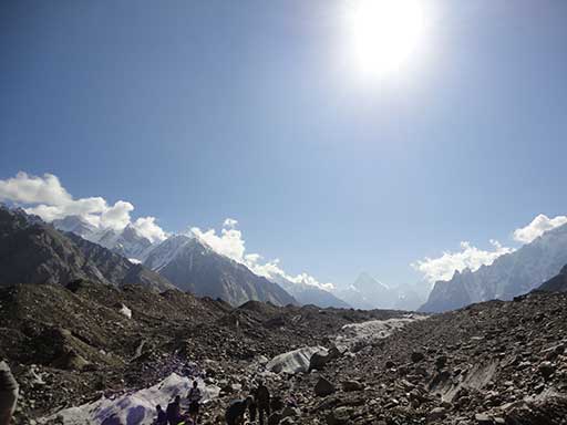 Day 15 | Heading south we cross several moraine ridges on the Baltoro glacier before turning up the Vigne glacier which is flatter and less crevassed. Early to bed for an early start tomorrow. 6 to 7 hours walking. |