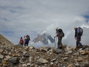 On day two we walked up the Braldu river to Paiyu on a good track. The weather was excellent but if anything, a bit hot. As the valley started to open up, the views were great and the only downer was arriving at camp to find one of the group’s bags was missing. Unfortunately a mule had lost its footing on a steep section high above the river and was lost along with a couple of bags. One bag was found in the flow just downstream that day but it still left us one bag down. A few frantic phone calls later and we had managed to persuade people from a couple of groups higher up the valley and on their way down to lend us some gear. Crisis averted.