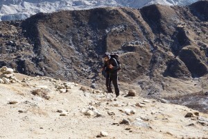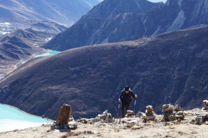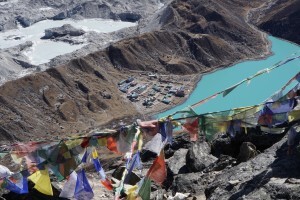 The ascent of Gokyo Ri had been approached with both excitement and trepidation, but it was time for all of this to be put away and all efforts to be concentrated on reaching the top! Over breakfast we all stared out the large windows at the leg achingly steep slope just across the water, and half of us responded by eating as much as possible, and the other half taking quite the opposite approach. We started the climb in our thick down jackets and gloves, as the morning chill still hung in the air, but it was not long before these were pushed into the bottom of bags – not to be removed again for a long while. The steep slope was unrelenting, and for at least the first hour the pattern of step, step, breathe; step, step, breathe was not interrupted by any change in gradient. The eventual lessening of angle and rocky scramble to the summit prayer flags were welcome sights, but remained painfully out of reach for at least another 20 minutes. When we finally reached the colourful cairn our pain lessened considerably (I’m won’t lie and say it disappeared) as the most incredible view opened around us. The complete Everest horseshoe was visible, along with Makalu, Cholatse, Cho Oyu, and countless other ‘himals’ (snow covered mountains in Nepali). We could have sat and stared for the rest of the day, and indeed we did spend the best part of an hour there, but all too soon it was time to turn around and make our way back down the dusty path to Gokyo – far easier in this direction!