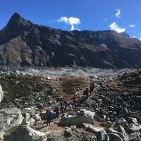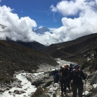 After crossing the mammoth groaning Nguzomba Glacier from Gokyo we arrived at the foot of the Cho La pass. Another pre-dawn start was rewarded with lunch of Tibetan bread atop the pass where we soaked up views of Cho Latse, Taboche and Lobuche East. As we continued the trek into the Khumbu it felt like the mountains were increasing in size as we gained views of the imposing Pumori, Lhotse and Nuptse.