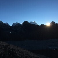 We rose early from our tents to catch the sunrise from the top of Kala Pattar, which offers the classic picture postcard views up the Khumbu icefall and up to Everest. It was the highest point of our trip and we breathed a sigh of relief that the rest of the trek was (mostly) downhill from here.